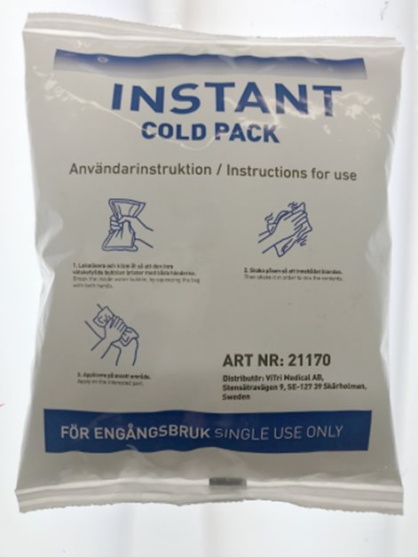 Kylpåse aktiveras och används för att kyla den skadade kroppsdelen, detta för att minska svullnad samt som smärtlindring.